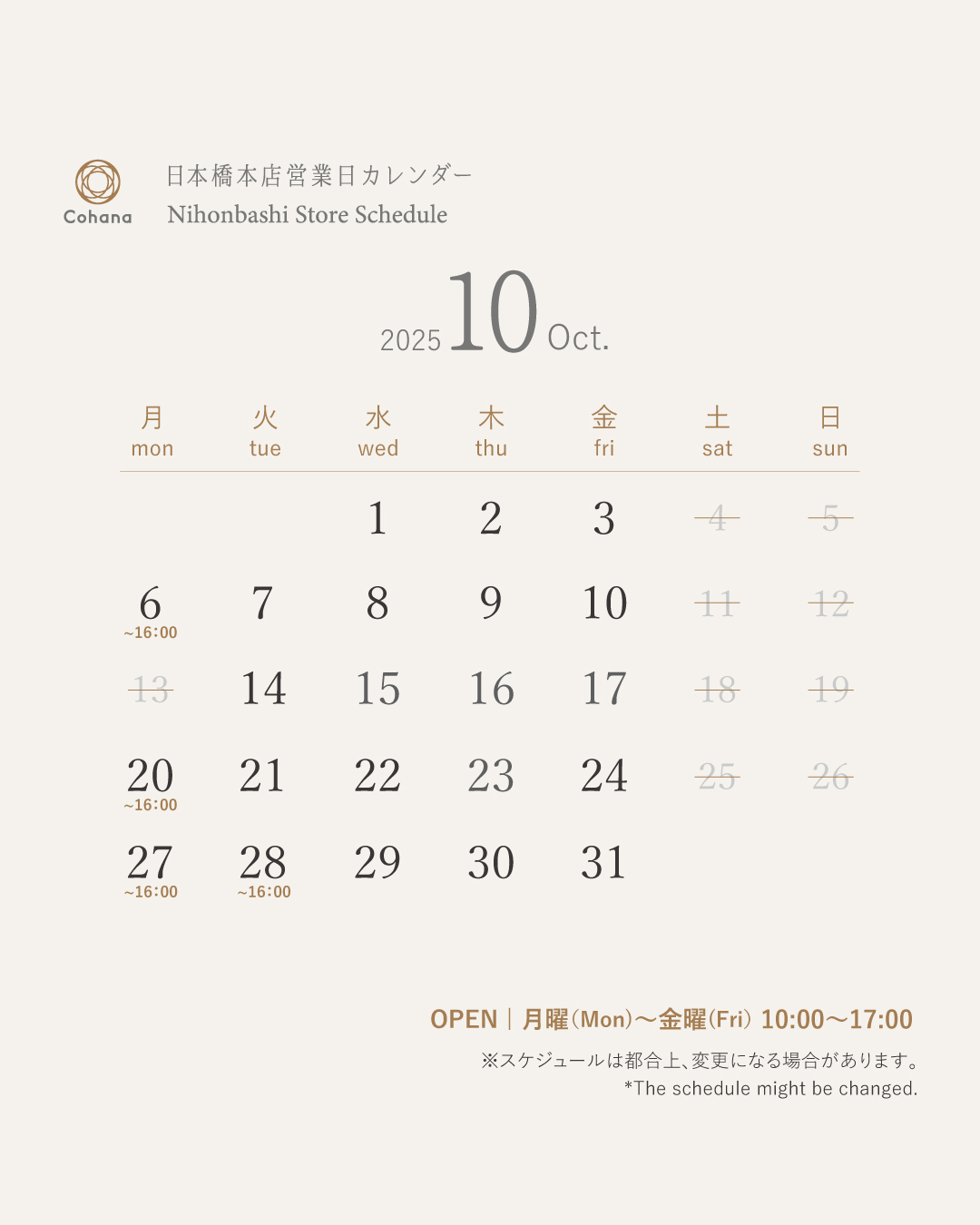 Cohana日本橋本店10月の営業日、催事のお知らせ
